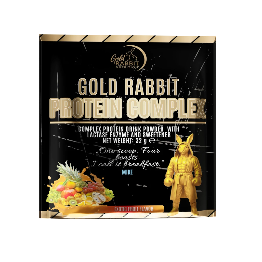 A Gold Rabbit Protein Complex – Exotic Passion egy négykomponensű fehérje italpor, amely szója-fehérjeizolátumot, tejsavófehérje-koncentrátumot, hidrolizált marhafehérje-peptideket és tojásfehérje-port tartalmaz egyetlen formulában. A különböző felszívódási sebességű fehérjeforrások kombinációja biztosítja a szervezet tartós aminosav-ellátását. A formula laktáz enzimet is tartalmaz, hozzáadott E-vitamin (D-alfa-tokoferol) antioxidánssal egészül ki, és mindössze 119 kcal adagonként. Egzotikus gyümölcs ízben, szukralózzal édesítve.